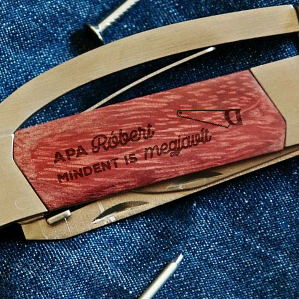 136x72x20 mm méretű (ha össze van csukva) multifunkciós szerszám, ami szilárd fémből, illetve kifinomult faanyagból készült. A hagyományos alakú fogó egyben kalapács is lehet. Az eszköz összes funkciója: