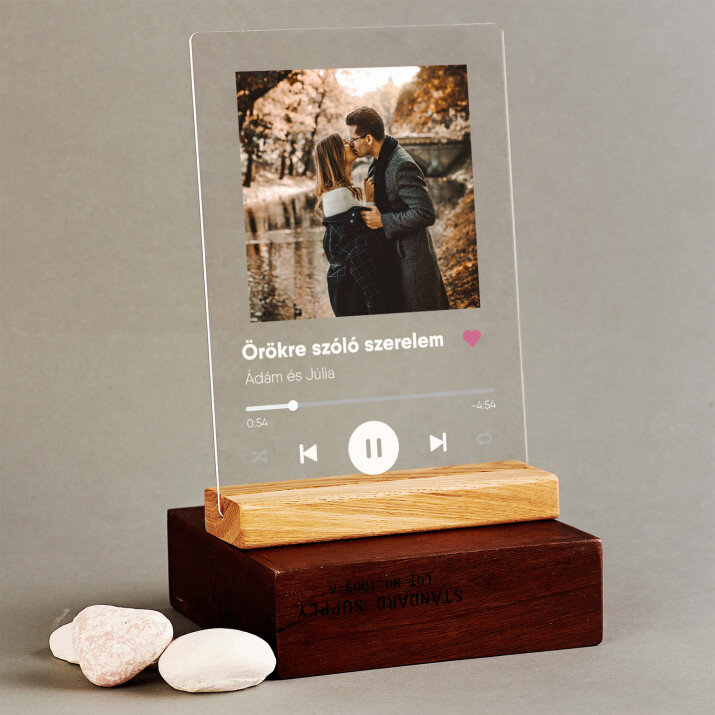 Különleges emlék, ami lenyügözi az ajándékozottat! A 2 mm vastagságú átlátszó akrilüvegre (plexiüvegre) készített nyomtatás olyan rendkívüli ajándék, amely évekig tart. Az anyag kiváló minőségű, merev, valamint ellenáll a meghibásodásoknak és az időjárási körülményeknek. Az elegáns fa állványnak köszönhetően a nyomtatást azonnal felhelyezheted a polcra. Garantáljuk, hogy ez remek meglepetés lesz a szeretteidnek!Különböző lehetőségeket kínálunk ehhez a nyomtatáshoz: