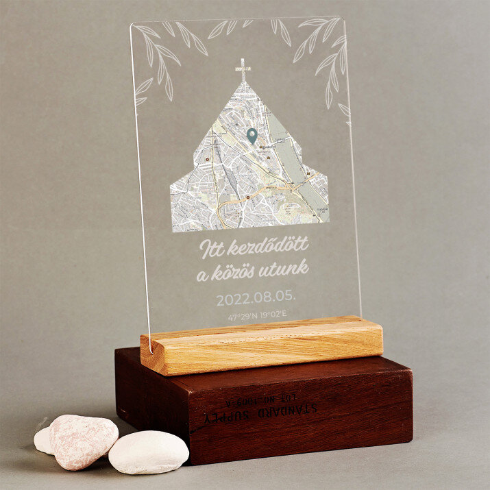 Néha csak be kell hunynunk a szemünket, hogy olyan helyekre utazhassunk, amelyek sokat jelentenek számunkra. Ezeket általában egy szerettünkkel, családunkkal vagy barátainkkal osztjuk meg. Különleges és fontos pillanatok jutnak akkor eszünkbe. Ezeket a közös emlékeket szimbolikusan egy olyan szokatlan ajándékba lehet áttenni, amely örömet okoz a szerettünknek.Az általad megadott elhelyezkedésnek köszönhetően ez az akrilüveg nyomtatás ideális esküvői, házassági évfordulós, illetve Bálint-napi ajándék. Tökéletes emlék lesz a barátaid számára is. Az általad kiválasztott helyszín (egy vagy több - a dizájntól függően), a személyre szabott elemekkel kiegészítve rendkívül elegánsan néz ki. Ez tényleg egyedi ajándék!
