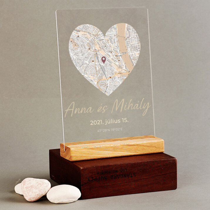 Az általad megadott elhelyezkedésnek köszönhetően ez az akrilüveg nyomtatás ideális esküvői, házassági évfordulós, illetve Bálint-napi ajándék. Tökéletes emlék lesz a barátaid számára is. Az általad kiválasztott helyszín (egy vagy több - a dizájntól függően), a személyre szabott elemekkel kiegészítve rendkívül elegánsan néz ki. Ez tényleg egyedi ajándék!