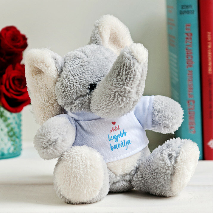 A Te nyomtatásoddal ellátott pólót viselő plüssmackó puha és kellemes tapintású. A póló poliészterből készült. A nyomtatás tartós, a színei élénkek. A plüssjáték a következő változatokban elérhető:- Elefánt - magasság 16 cm