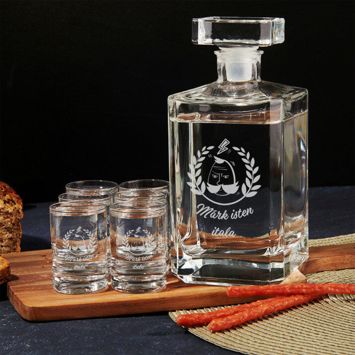 Gravírozott pálinkás dekantáló és 6 db gravírozott pálinkás kupica készlete.