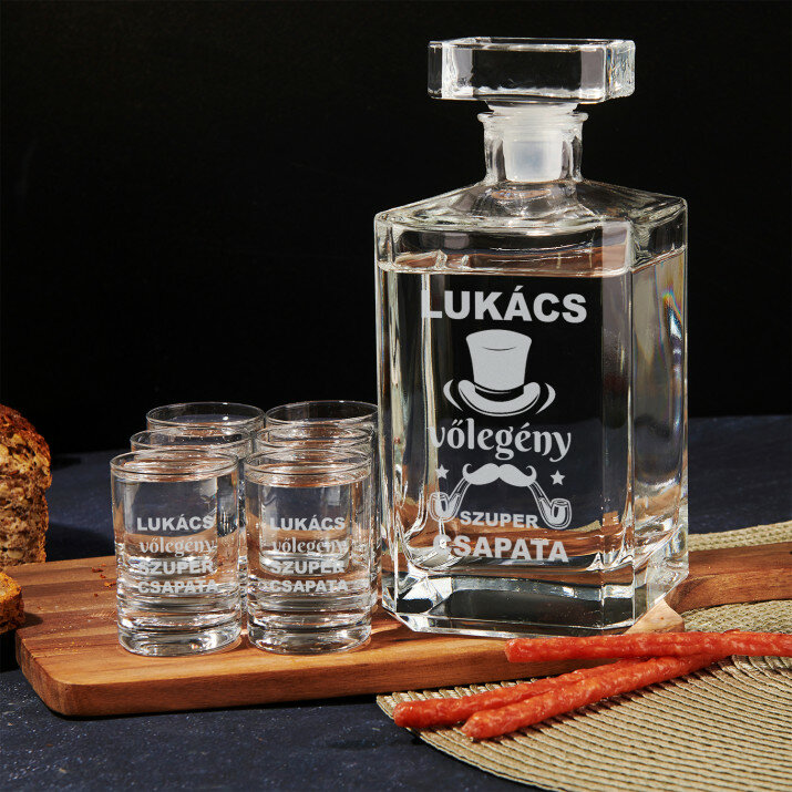 Gravírozott pálinkás dekantáló és 6 db gravírozott pálinkás kupica készlete.A dekantáló kiváló minőségű átlátszó üvegből készült. Egyszerű formájával és finom kivitelével a termék mindenhol elegánsan néz ki. A szögletes forma megtöri a fényt, ami gyönyörűen kiemeli az ital színét.Űrtartalma 70 dl, magassága 19,5 cm, szélessége 8,5 cm.